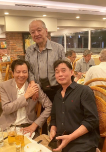 〈下右写真:〉ハノイで開催した祝賀食事会には第1回チャリティーコンサートに来日してもらったハノイ市立タンロン楽団のリーダーNguyen・Huynh・Tuさん(写真内左)、Hoang・Anh・Tuさん(写真内右)。Nguyen・Huynh・Tuさんは作曲家で楽器・ダン二や楽器クニの著名な演奏家、Hoang・Anh・Tuさんは楽器ダンバウの超有名な奏者。JVPF鎌田篤則副理事長とは20年ぶりの再会となった(5月2日、祝賀食事会で)