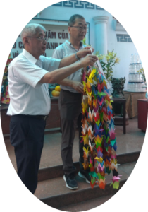 「グエン・チー・ビン元国家副主席と語り、クアンナム省枯葉剤被害事情を視察する訪問団」が7月31日から実施される。この訪問の際、平松伴子会員は『平和友好勲章』をベトナム友好委員会連合より授与された。平松さんはグエン・チー・ビンさんが会長を務めるベトナム平和開発基金に本の印税分40万円が枯葉剤爆弾被害者支援としての寄贈。
