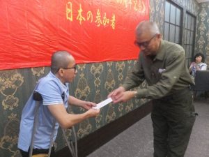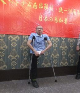 ・50周年前夜祝賀会をホーチミン市内で開催 JVPFはベトナム解放統一50周年を記念した訪問団を呼び掛け、JVPF基本グループの他、鹿児島JVPFグループ、KVPFグループ、尼崎グループの総勢38名がホーチミン市で前夜の記念食事会が開催された。この会には、これまで枯葉剤爆弾被害者支援チャリティーコンサートに参加していただいた音楽家、舞踊家などが参列。さらにグエン・ドクさんにも駆け付けていただいた。尼崎グループはドクさんに支援金を寄贈(下左写真)した。