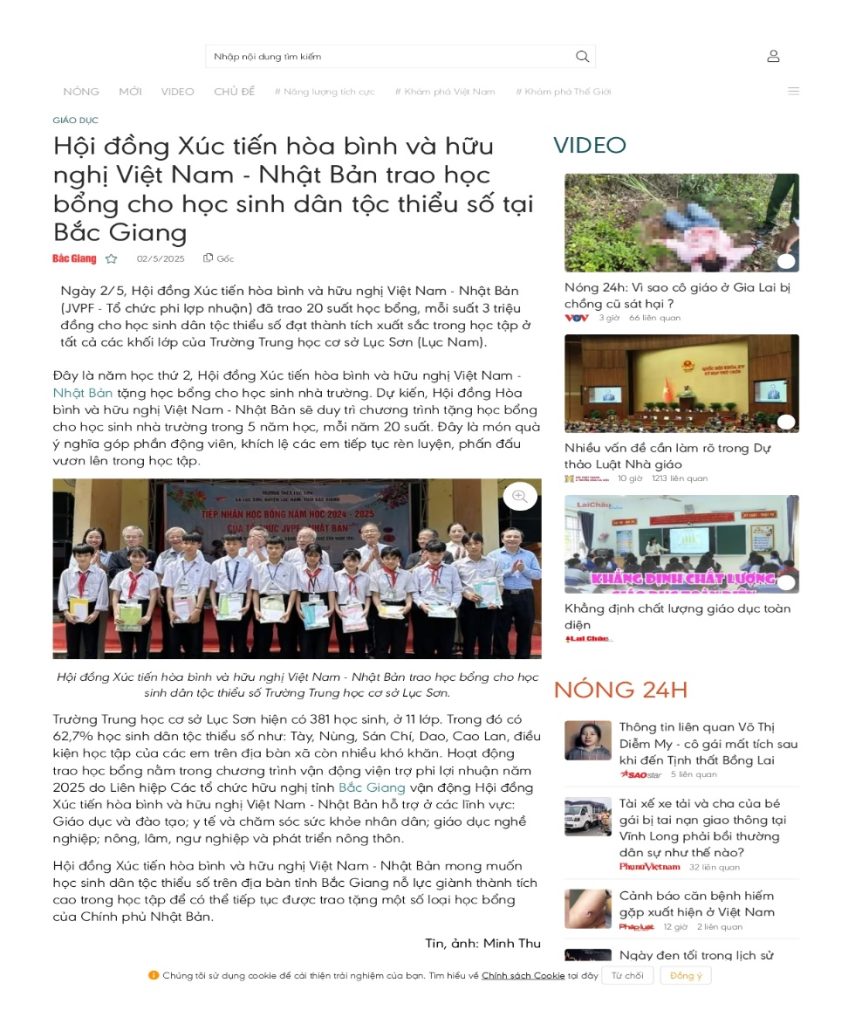 ●鹿児島JVPFグループはホーチミン市の行事の跡、5月1日~2日、北部バクザン省を訪問し枯葉剤爆弾被害者の調査・慰問2軒(下写真上)と、リョクソン社中学校での2年目となる少数民族出身学生奨学金贈呈(下写真下:現地新聞から)を実施した。